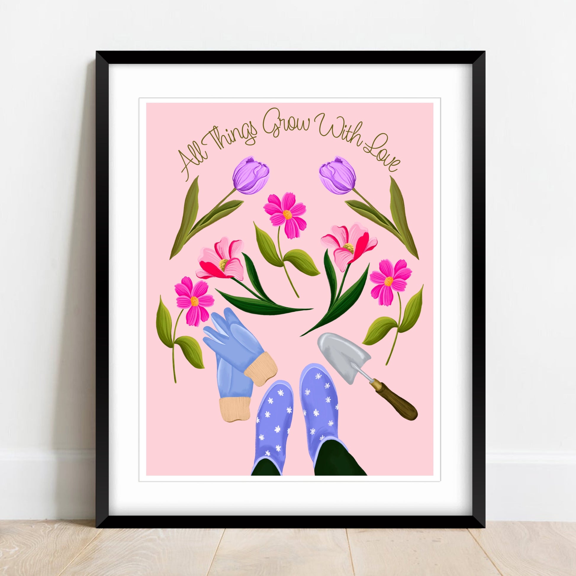 Bring love and joy to any room with this charming wall art print! Its cheerful pink colors and whimsical gardening scene make it the perfect addition to nurseries, kid bedrooms, and other spaces. Best of all, the message reminds us that "all things grow with love"!