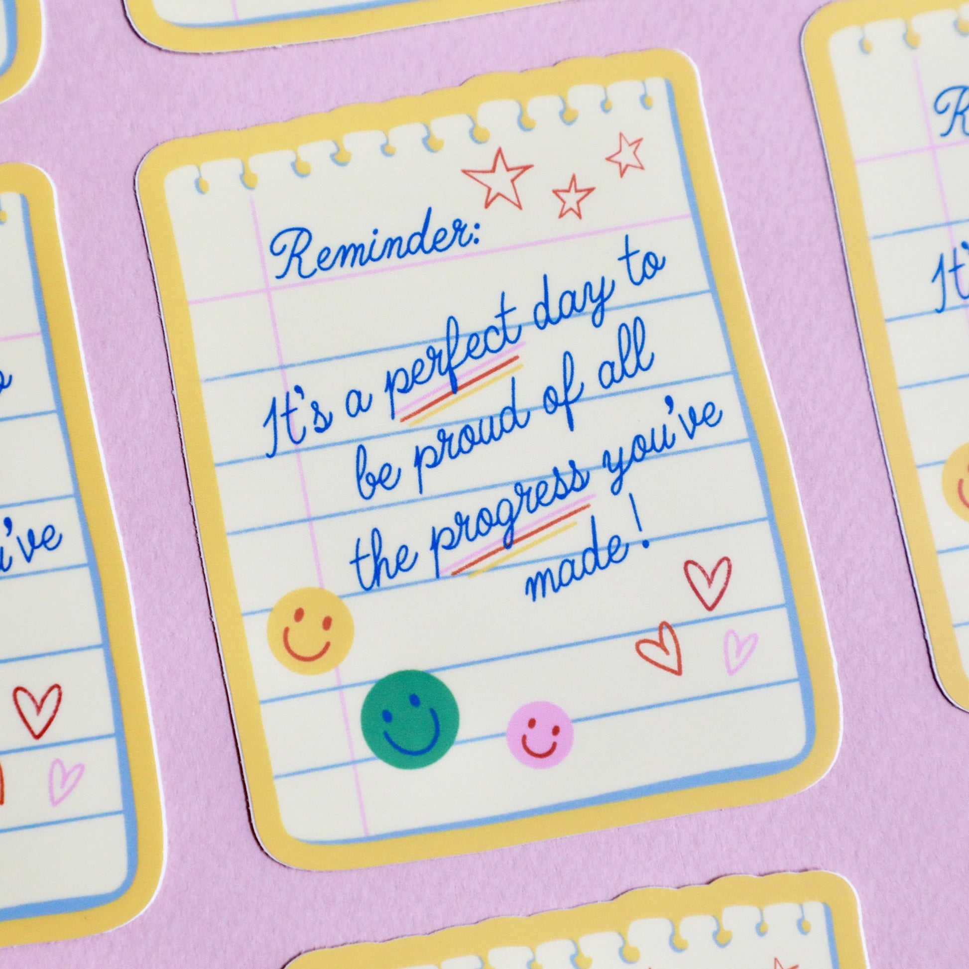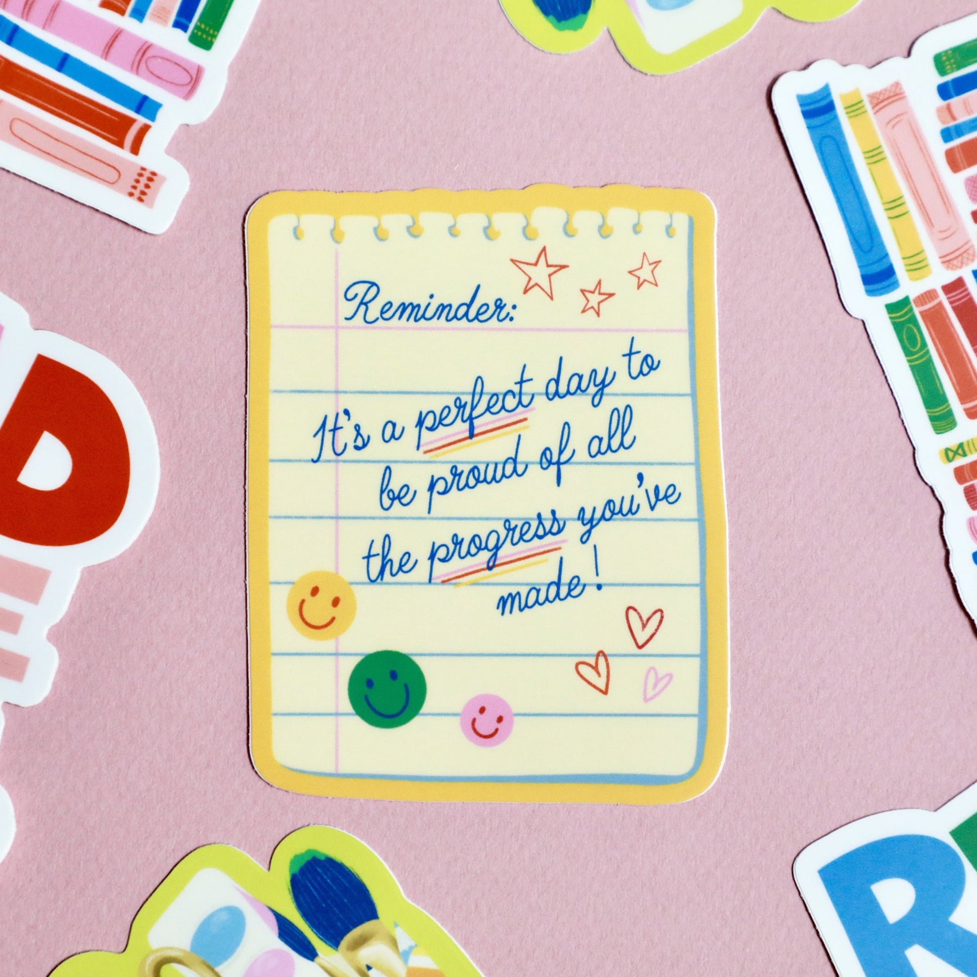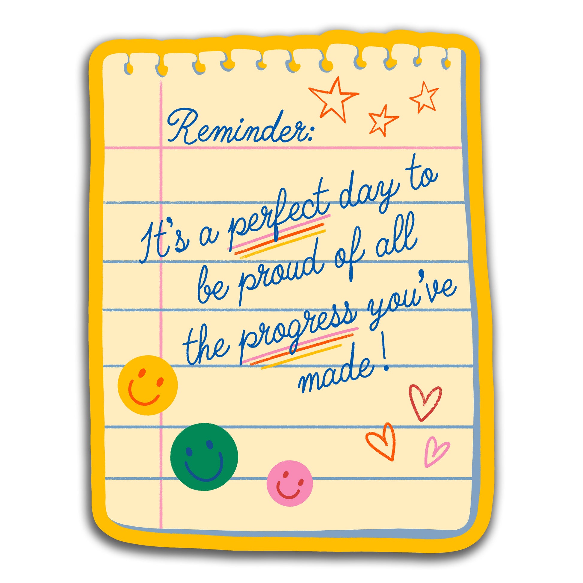 Celebrate success with this weather-resistant vinyl sticker! Illustrated as paper from a notepad, it reads, "It's a perfect day to be proud of all the progress you've made." With playful cursive and fun smileys, it's a quirky way to stay motivated. Waterproof and long-lasting, apply it to any surface.