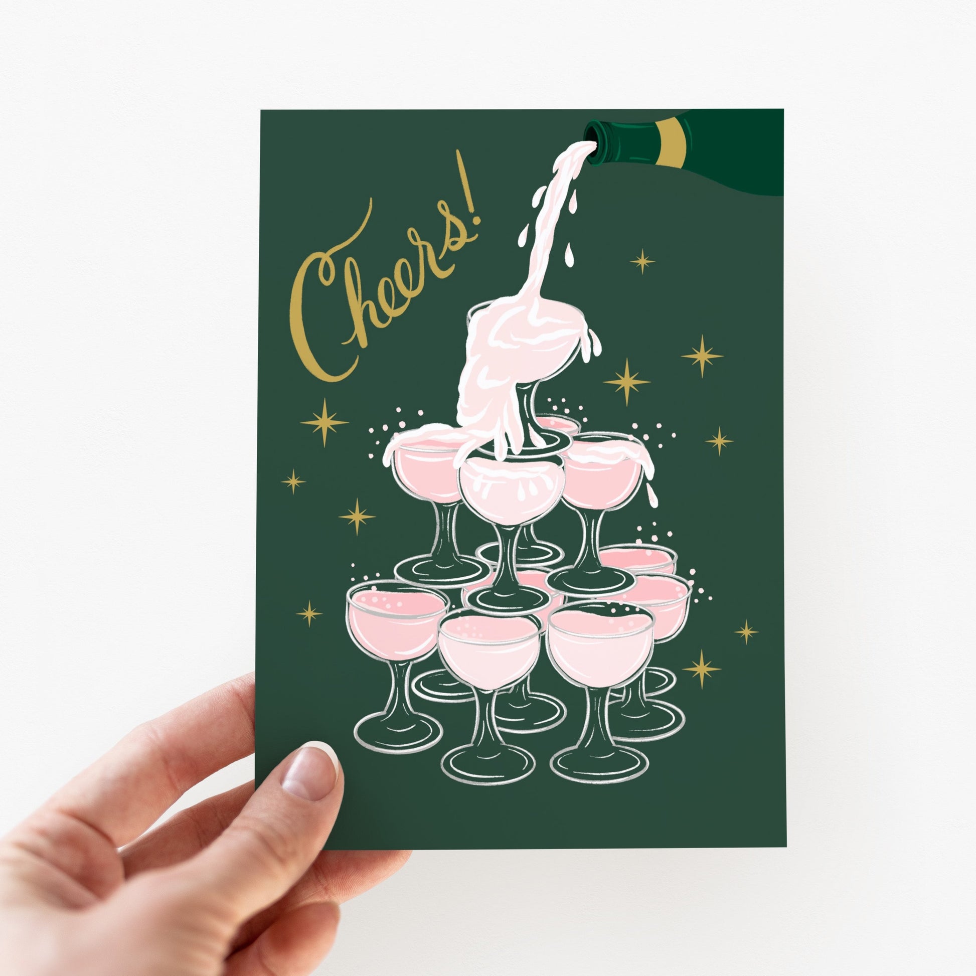 Cheers to the happy couple! Help the special couple in your life celebrate their new engagement or wedding with this whimsical champagne tower wedding/engagement card. This dreamy greeting card features a pink champagne tower overflowing with bubbly and the word "Cheers!" in a beautiful hand lettered script.
