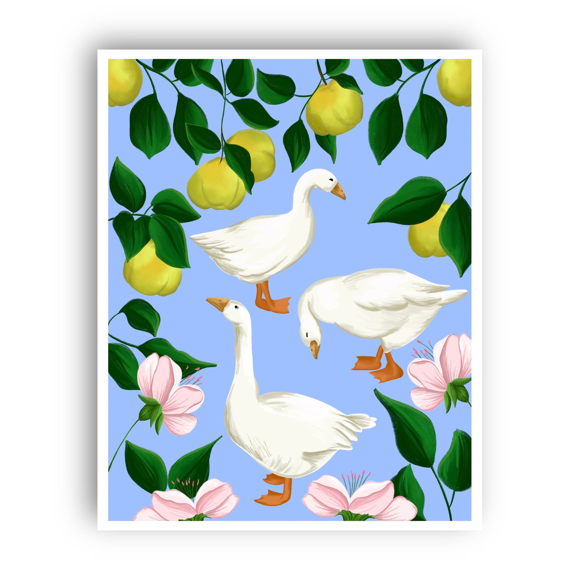Give your home a hint of whimsy with this delightful Ducks and Pears Wall Art Print! Showcasing a beautiful array of white ducks, luscious ripe pears, and pear blooms, this print looks like the perfect piece of cottage charm. A delicate, pretty way to complete your space!