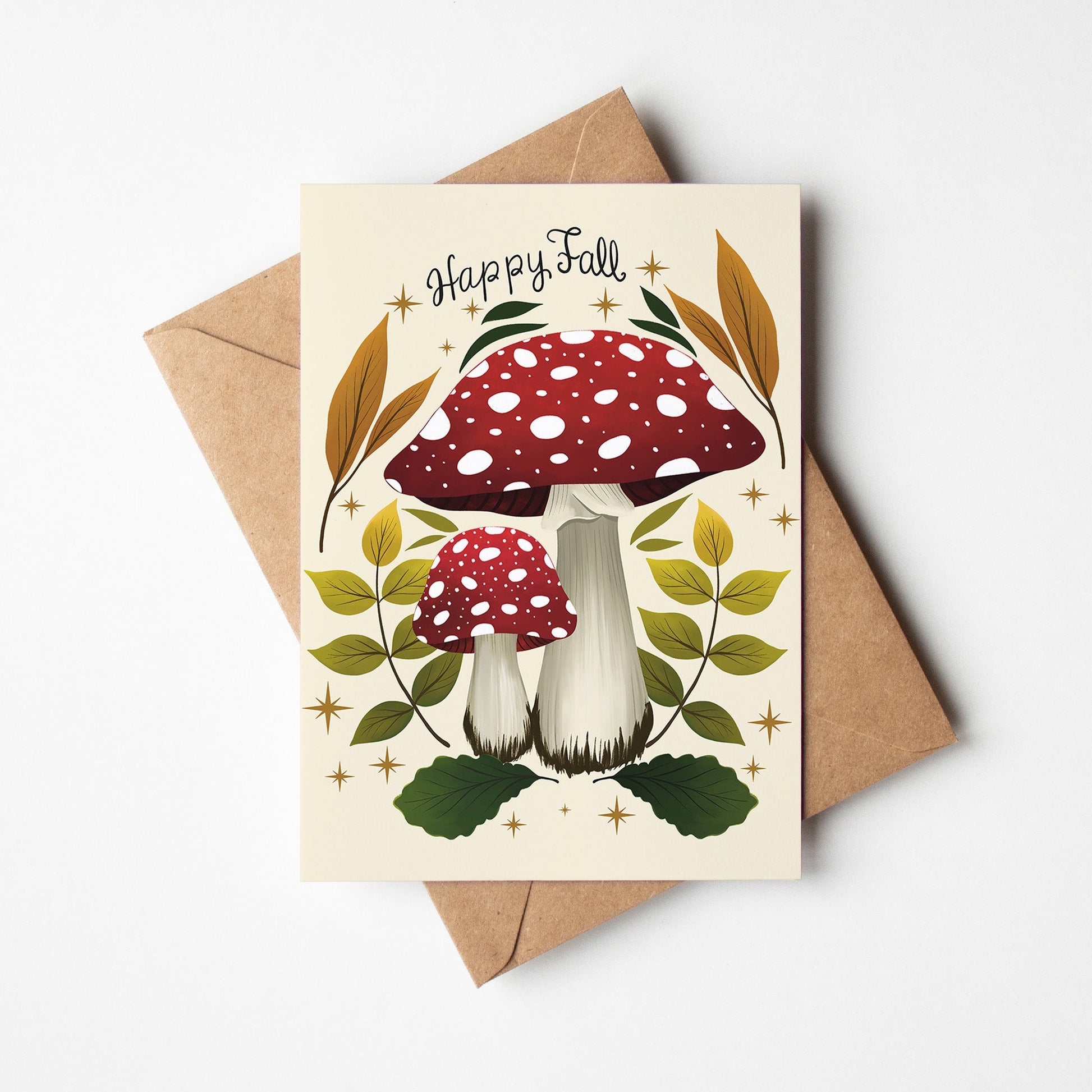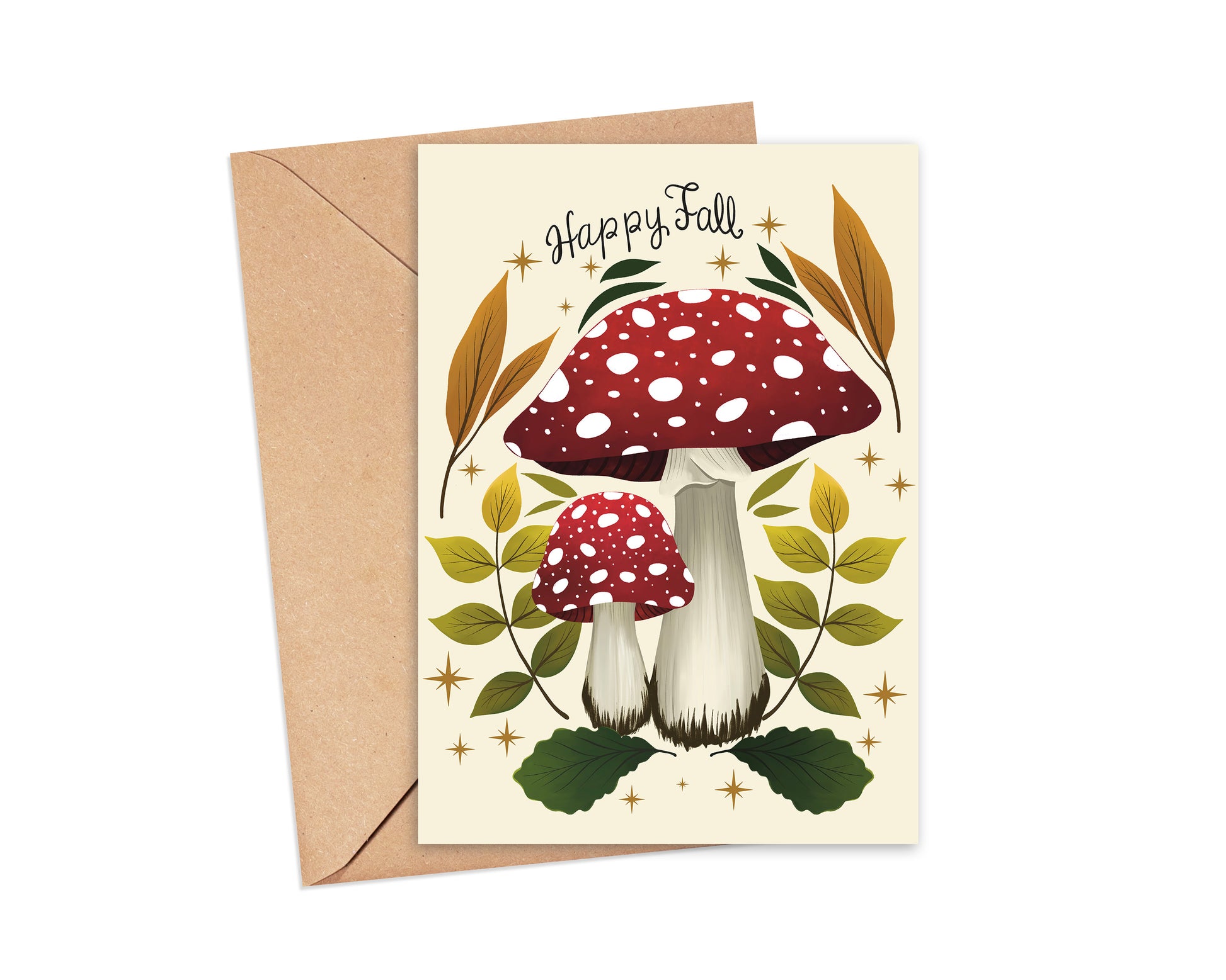 Help someone celebrate the fall season with this Happy Fall greeting card. The card features hand illustrated mushrooms and fall foliage with the words "Happy Fall" in a whimsical hand lettered script.