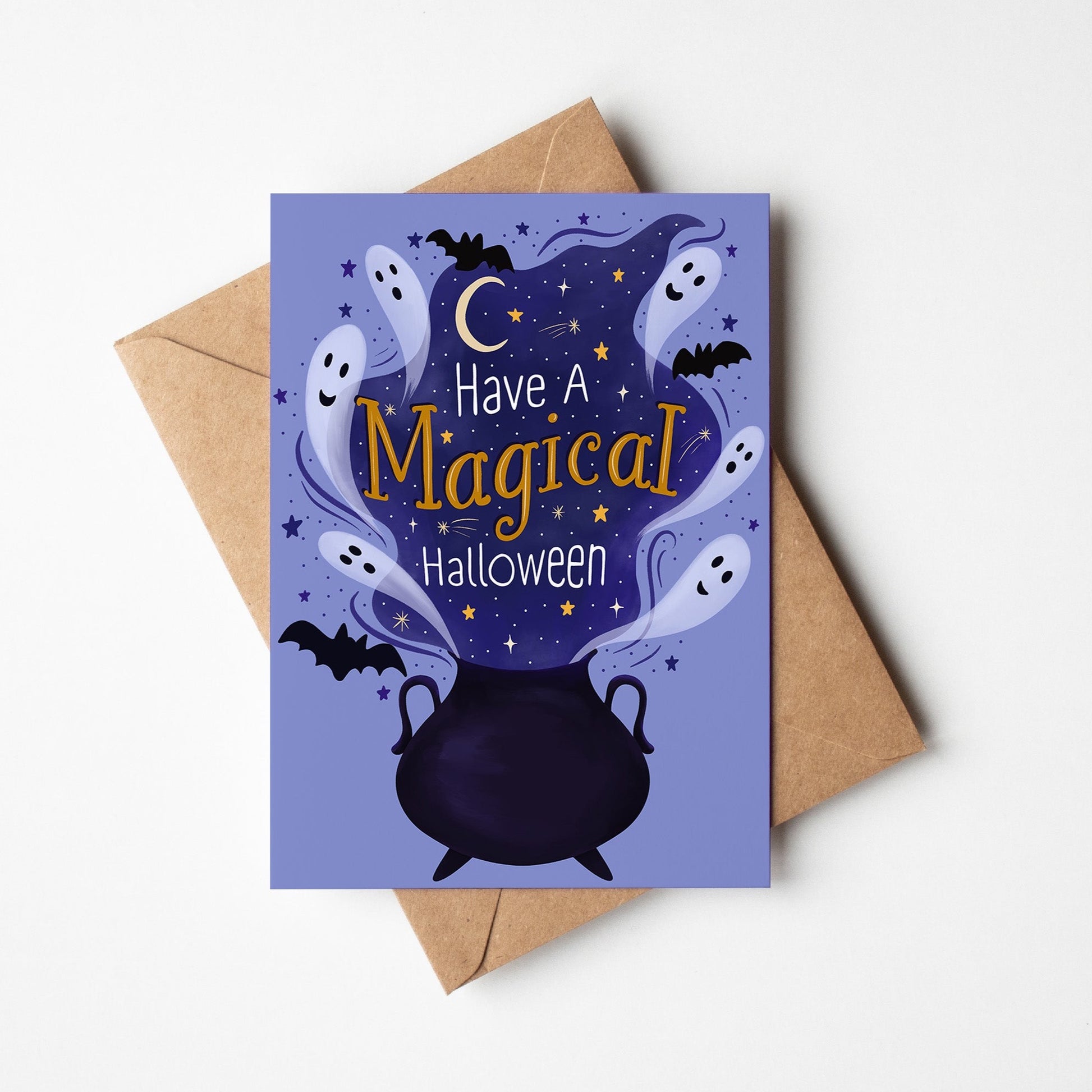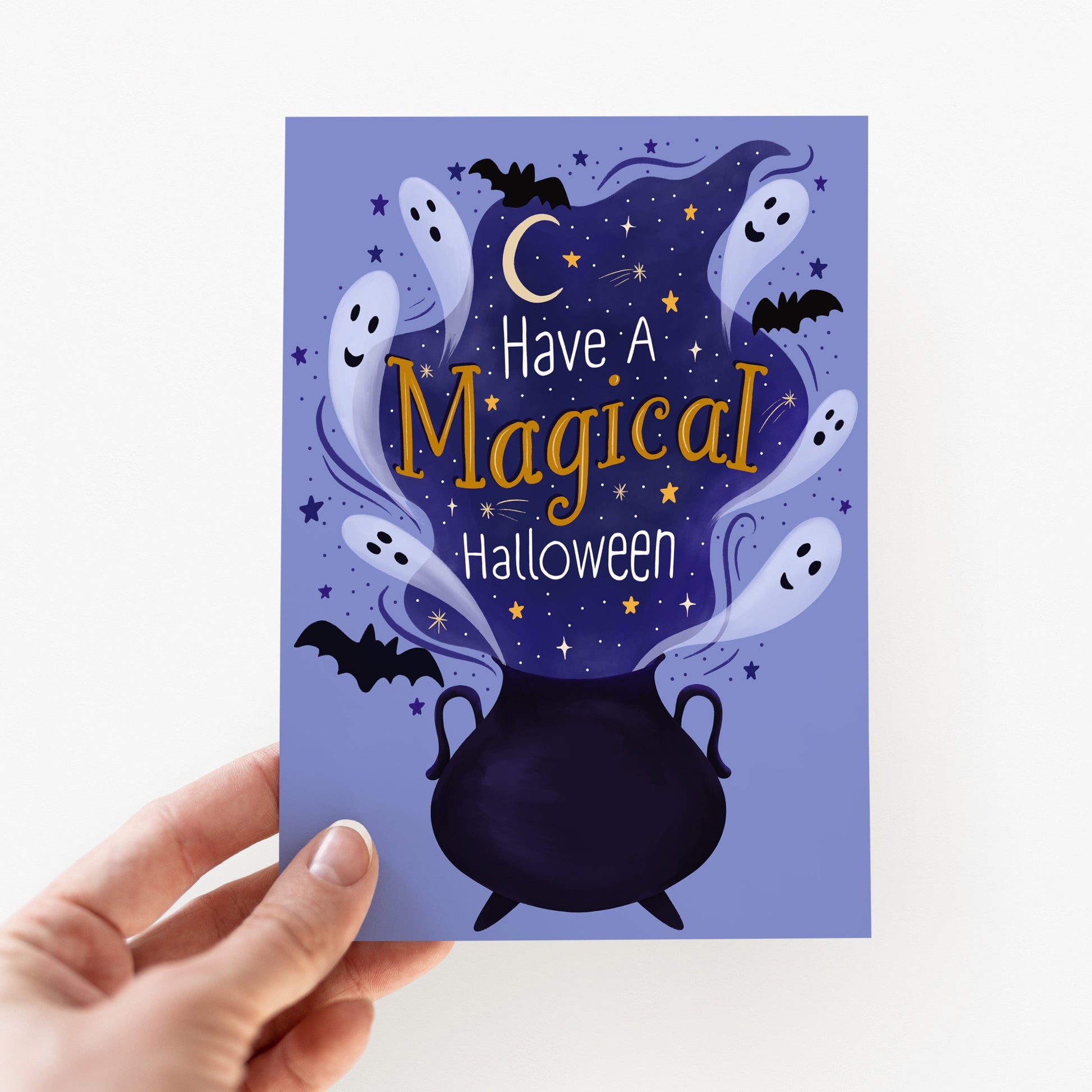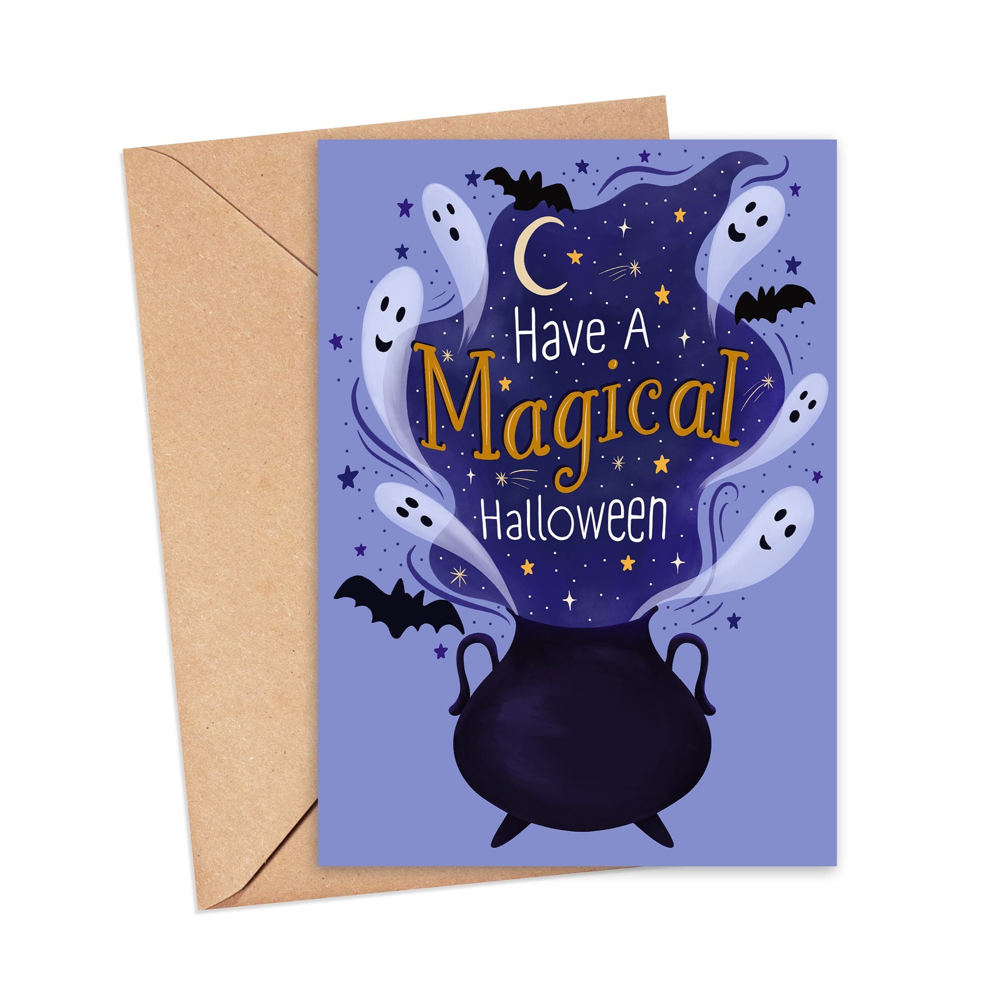 Experience a magical Halloween with this fun, spooky greeting card! Featuring a cauldron that bubbles and brews up a star-filled, ghost-filled night, this greeting card is sure to make any Halloween a memorable one. Bewitch your loved ones with this truly unique card!