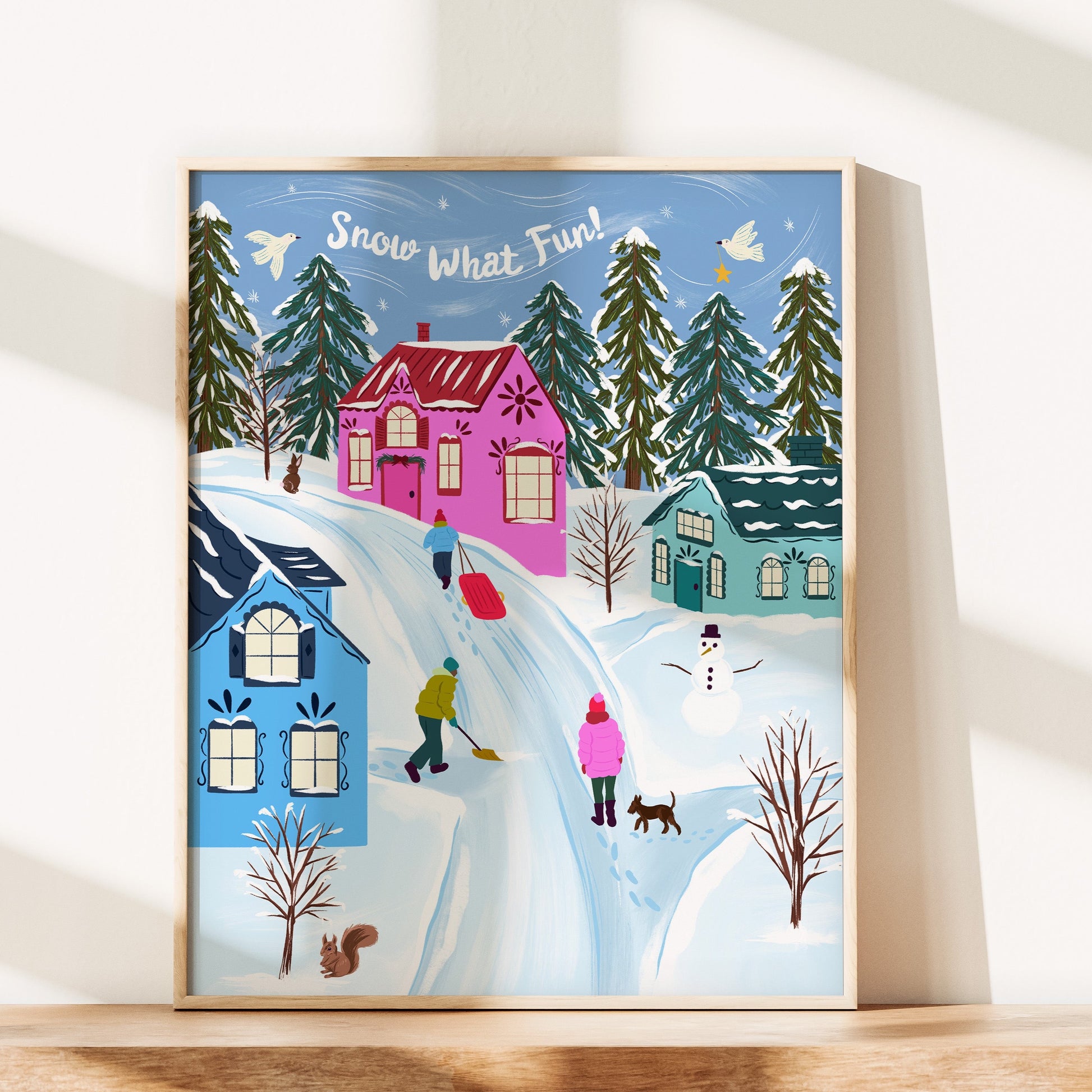 Enjoy a whimsical snow day with the Snow What Fun Wall Art Print! I illustrated this art print after the first snow of the season here in Colorado. It felt so magical and made me reminiscent of the snow days we had growing up! This illustration features a playful winter scene of snow-capped trees, cozy homes, and folks enjoying some winter activities, this print is sure to add a cheerful touch to your decor! Plus, it's full of cute critters, like birds, squirrels, and bunnies, for even more fun!