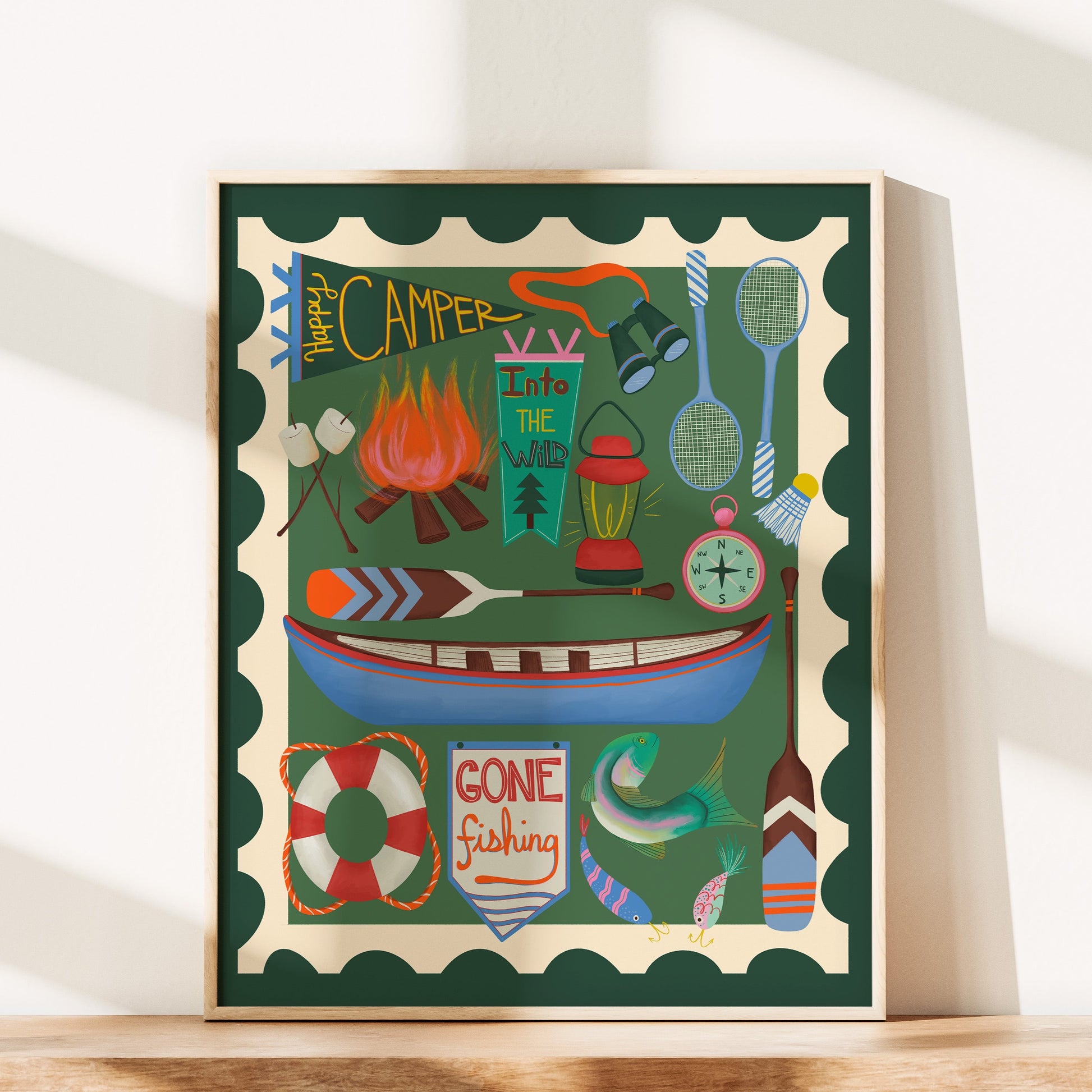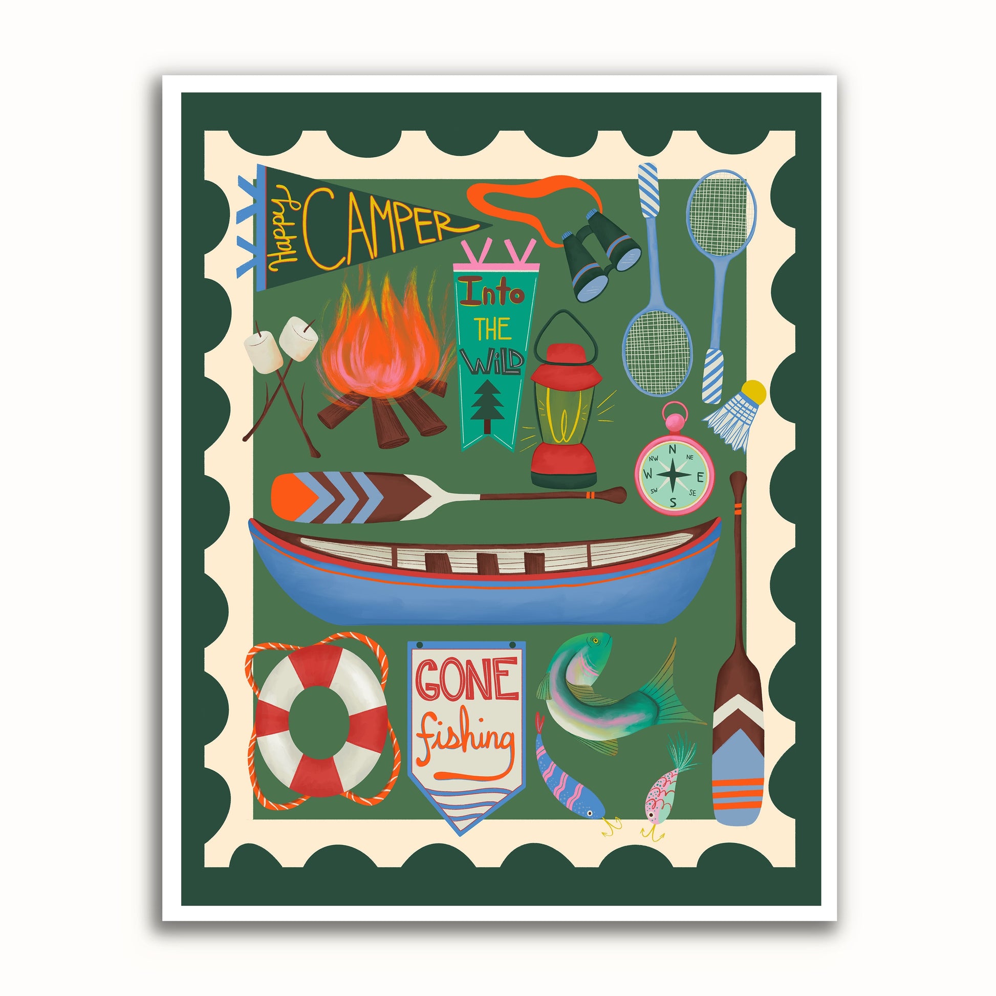 Get ready for a whimsical adventure with our Summer Camp Wall Art Print! Illustrated like a stamp, this print features all the essentials for a fun camping trip, from a canoe to a campfire with roasting marshmallows. Perfect for any camper, this print will bring a touch of nostalgia and excitement to any room!
