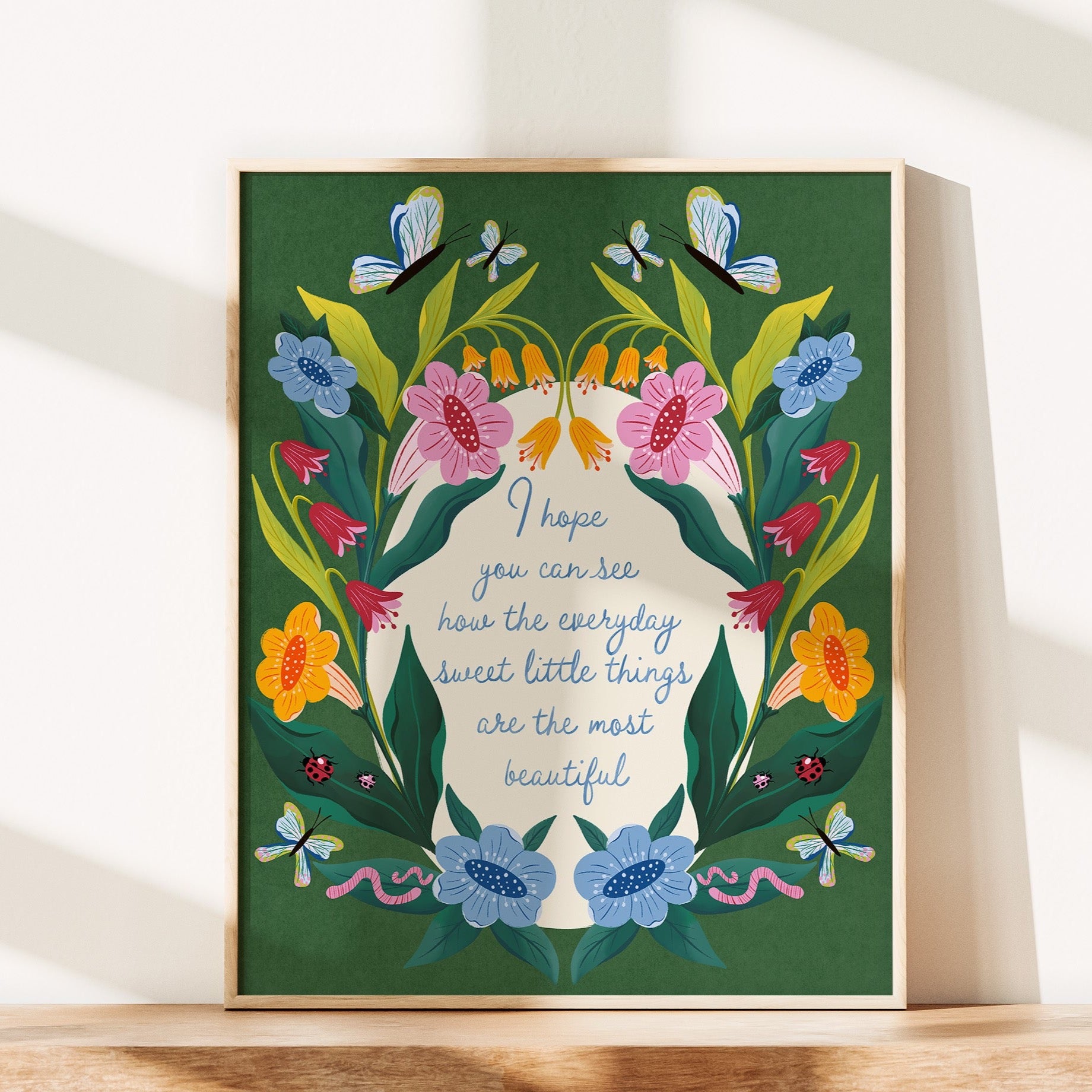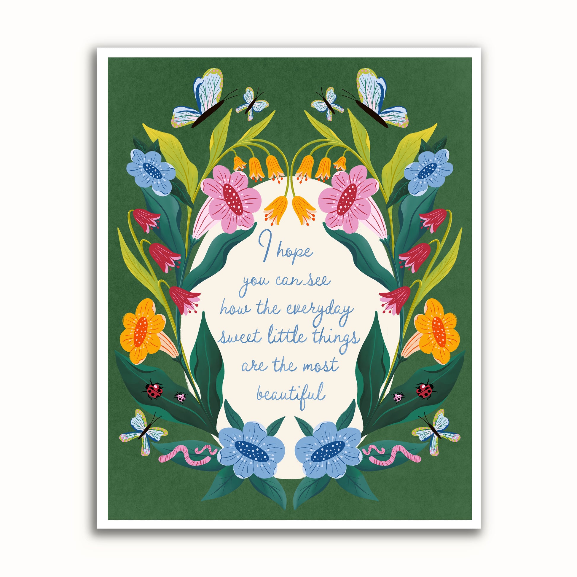 Celebrate the beauty of life with our Sweet Little Things Wall Art Print. This charming print features a whimsically illustrated garden filled with colorful flowers, beautiful butterflies, and friendly insects. Surrounding a hand lettered quote, this print serves as a sweet reminder to appreciate the little things in life. A sweet addition to any nursery or kids room.