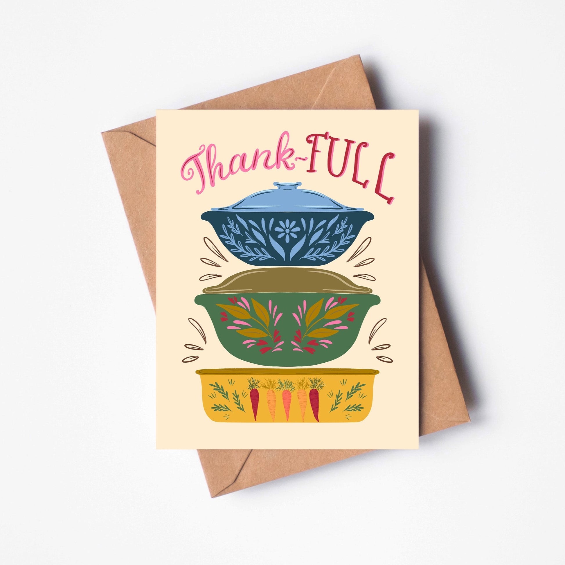 Celebrate Thanksgiving with this heartwarming A2 greeting card. Adorned with whimsically illustrated vintage dishes overflowing with food, it's sure to make your loved ones feel "Thank-FULL". Show your gratitude and send them this heartfelt card.