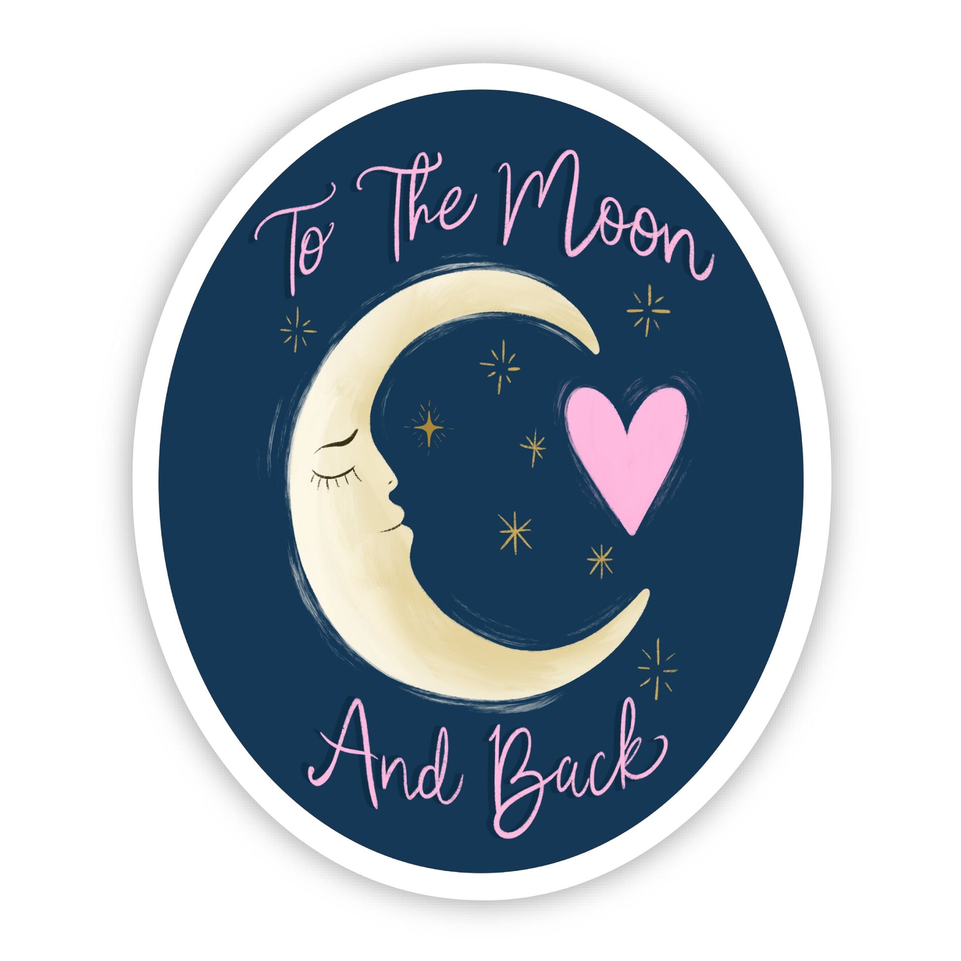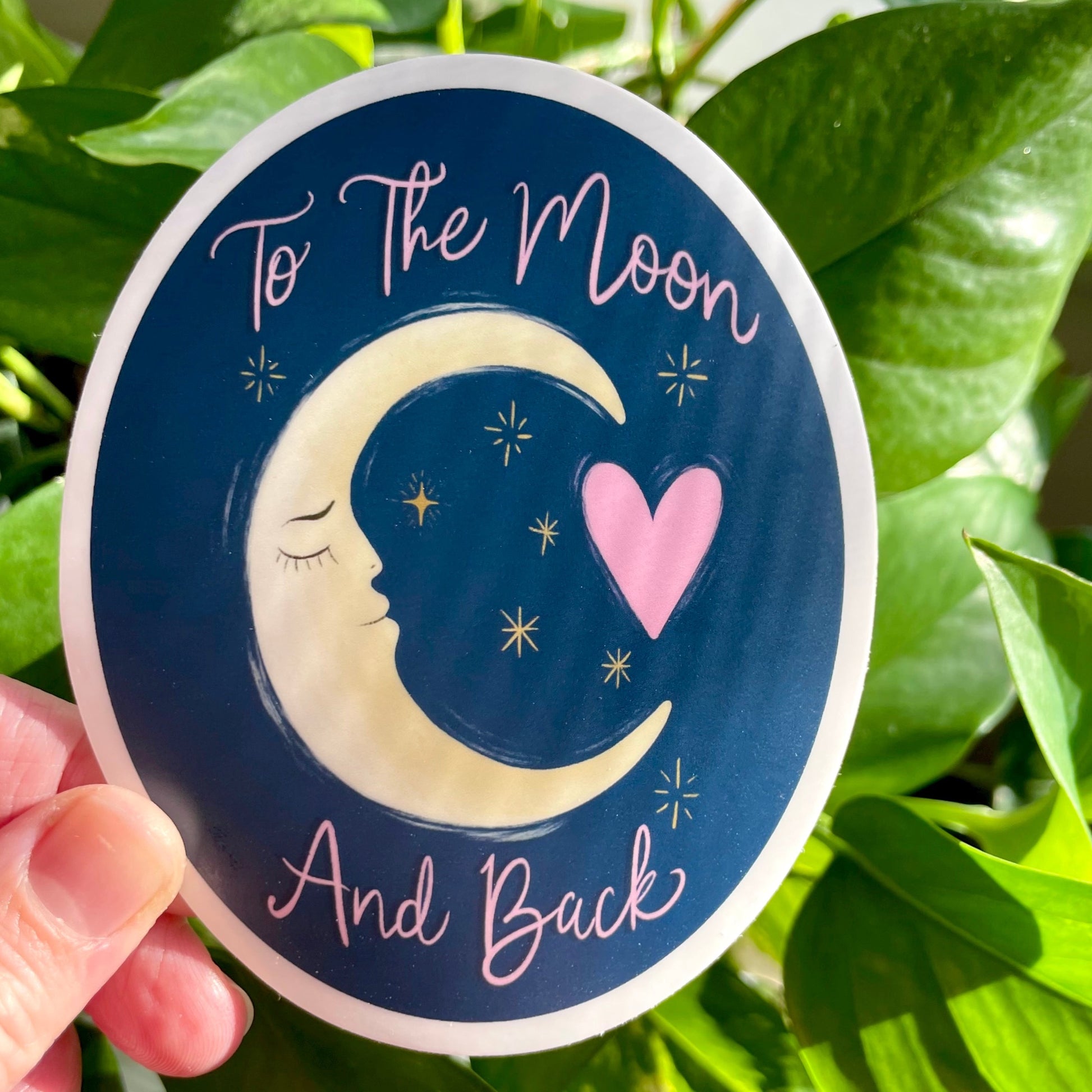 Express your love with this hand illustrated moon sticker! A whimsical take on the classic phrase "to the moon and back," it's perfect for all the romantics and star-gazers out there.
