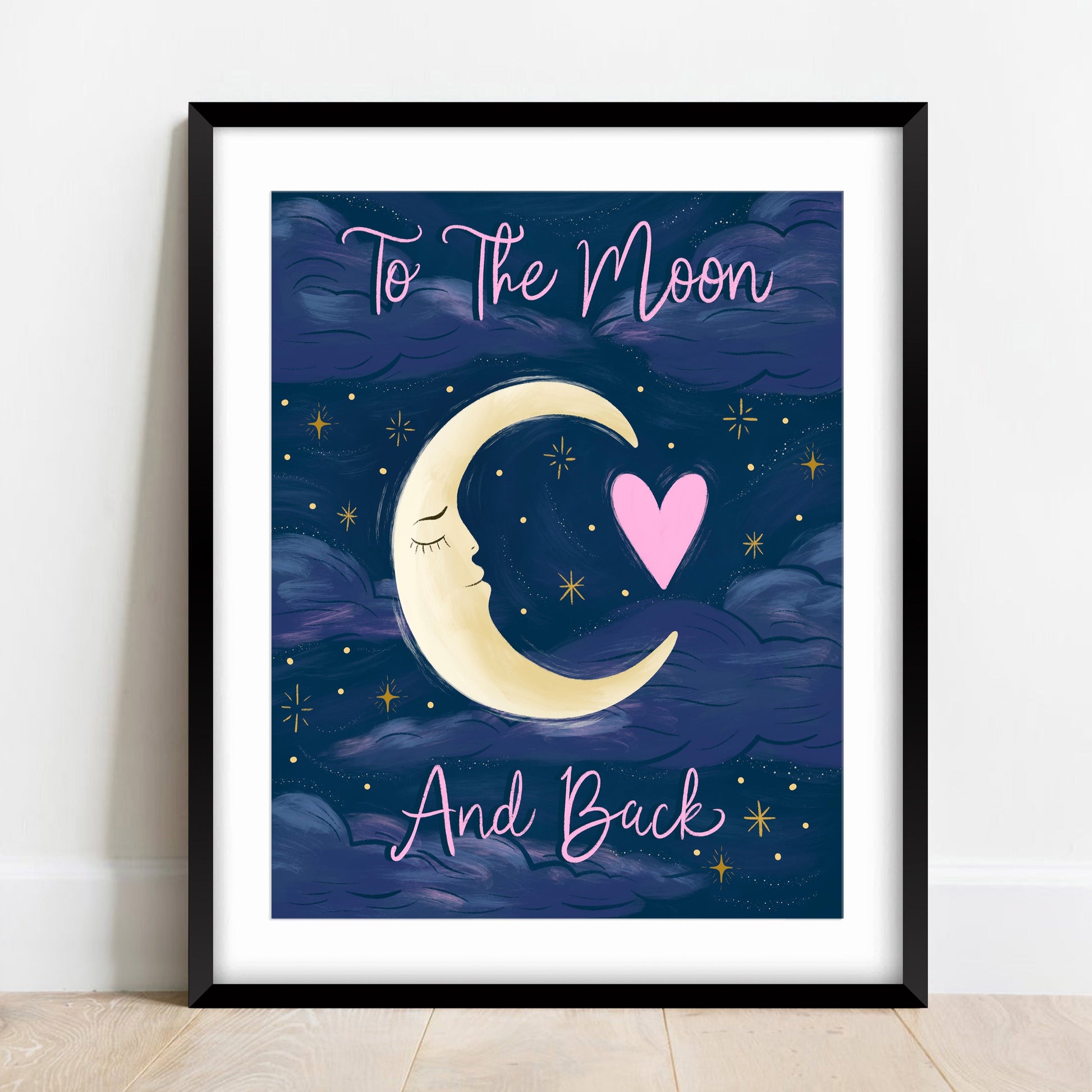 This I love you "To The Moon And Back" whimsical art print is the perfect addition to a little one's nursery. I illustrated this piece because I absolutely love this saying and it's such a sweet message that can be shared between a mother and child. A whimsical design featuring the moon, stars, hearts and a sweet message will show your little one how much you care. This art print also makes a lovely gift for new parents to help celebrate the wonderful new addition in their life!