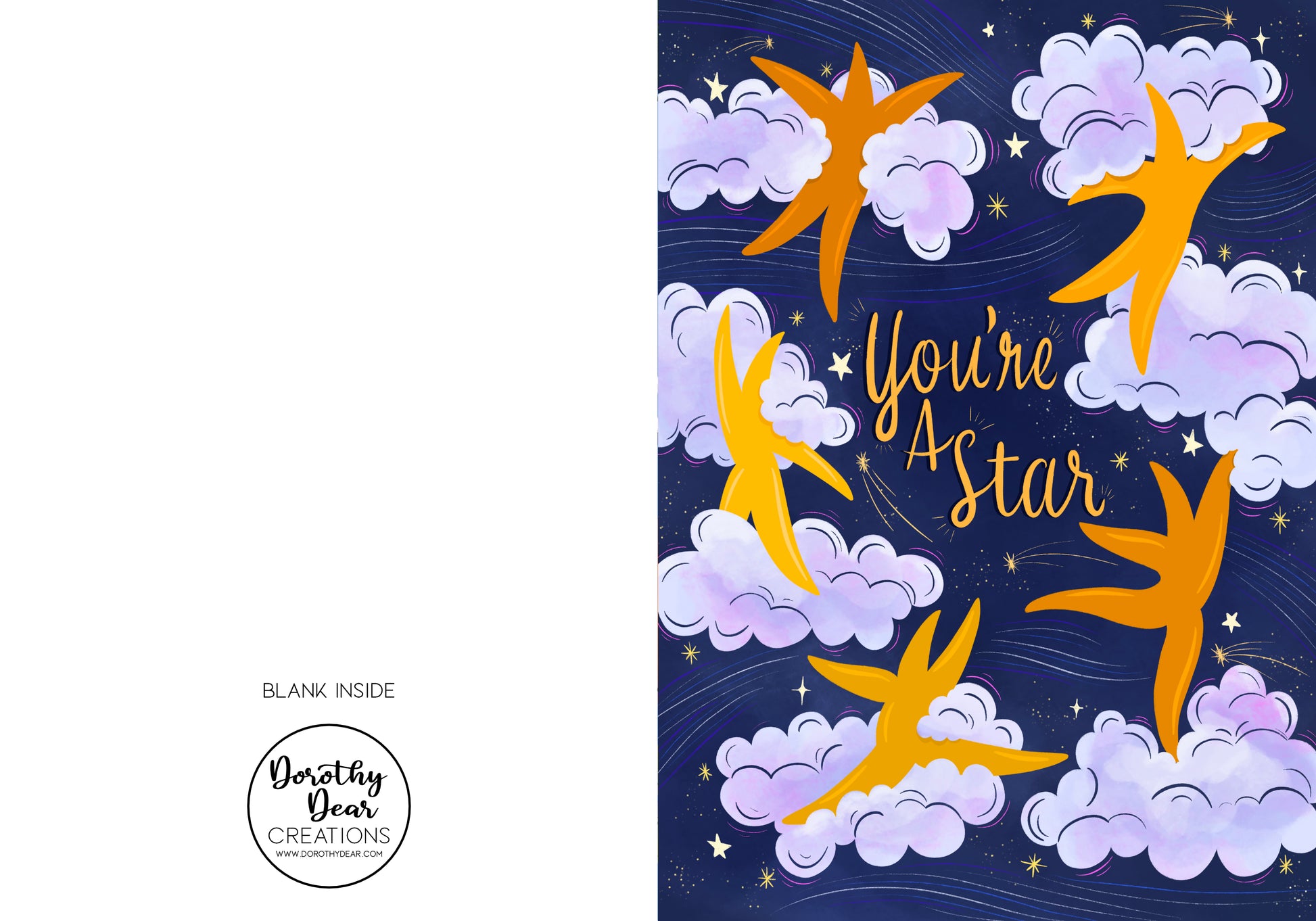 Spread some cheer with our You're A Star Greeting Card! Gold stars playfully dance around a beautiful sky, intertwined with pretty clouds. The perfect way to let someone know they're a star in your eyes.